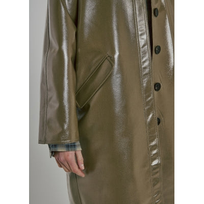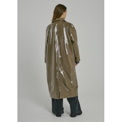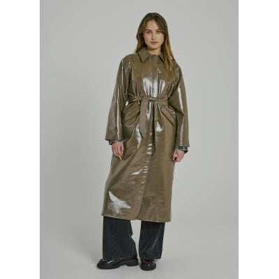 lange lak trench coat met blouse kraag en centuur, steekzakken.