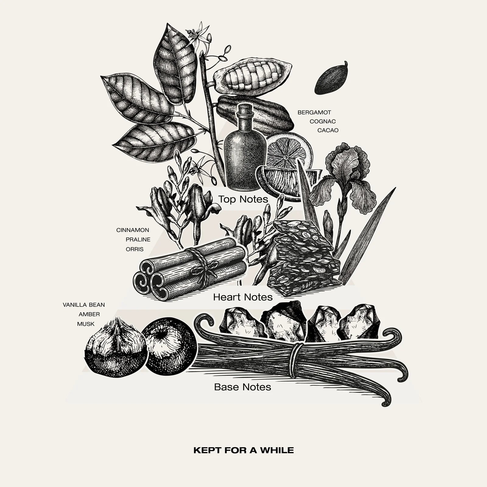 Op een winteravond omhult Kept for a While eau de parfum (50 ml) je als een kasjmier deken: de rijke zachtheid van cognac en praliné die samensmelt met de huid, romige cacao met een vleugje kaneel, en daaronder de glow van amber en muskus.